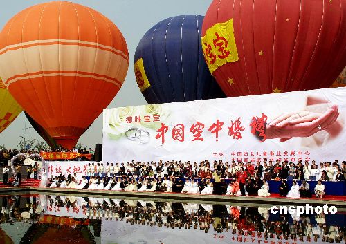 10月26日上午,来自上海的俞同盛、施红英夫妇乘坐热气球,庆祝他们的金婚纪念日。当日,中国婚庆史上空前盛大的空中婚礼在江苏省南通市举行,来自全国各地的56对佳偶分别乘28只热气球联袂升空,请蓝天证婚,以大地为媒。此次活动是全国首届航运会的压轴节目之一,并开创“空中婚礼”上海基尼斯世界记录。作者:尤炼