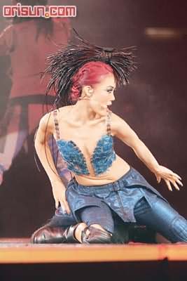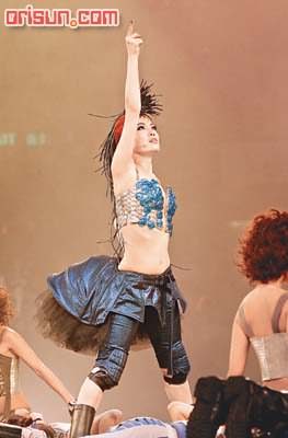 中新网10月27日电 据香港媒体报道,容祖儿演唱会昨晚在红馆开锣,挑战性感极限的她穿上中空小Top,酥胸半露,劲歌热舞时更一度离罩,险露点万人前,全场观众为她抹一把汗!