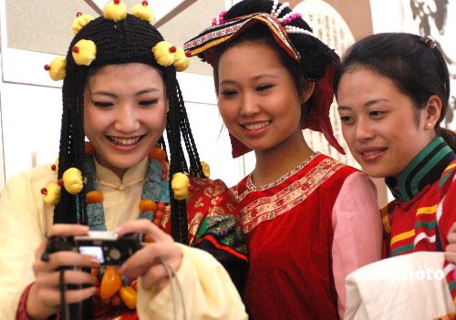 十月二十七日, 由中国少数民族文化艺术促进会主办的“中国首届民族自治区地方民族文化博览会”在北京展览中心开幕。图为少数民族模特在展区合影留念。作者:邹宪