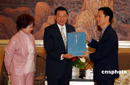 十月二十九日中午,中共上海市委副书记罗世谦(右)在上海虹桥迎宾馆会见中国国民党副主席江丙坤夫妇,以及江丙坤率领的“中国国民党台商服务中心大陆访问团”一行。图为罗世谦向江丙坤赠送《上海历史地图集》。作者:潘索菲