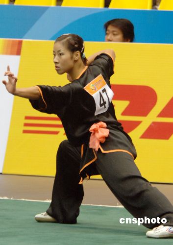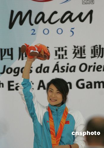 上午九点开始的武术女子南拳套路决赛,中国队没有派选手参加,东道主中国澳门选手黄燕慧在比赛中以一套突出闽南南拳特点的自选套路技压群芳,赢得了观众的阵阵喝彩。在比赛中,身材娇小的黄燕慧闪拿得力、腾挪有致,动作流畅,一气呵成,最后赢得了九点七五的高分,使本届东亚运首金花落澳门。