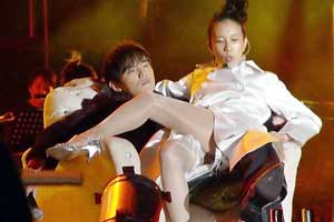 中新网11月1日电 据《新明日报》报道,近日莫文蔚性感亮相上海虹口足球场开个人演唱会。演唱会上,莫文蔚大胆挑逗周杰伦,竟然坐上了周董的大腿。而其男友冯德伦却摇萤光棒疯狂叫好。