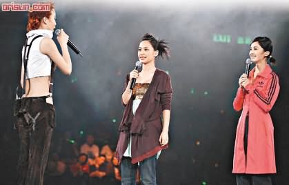 中新网11月1日电 据香港媒体报道,容祖儿前晚继续举行其第五场演唱会,邀请Kenny(关智斌)和Twins任嘉宾,但祖儿却摆阿娇和阿Sa上,她见到阿Sa即说:“你是不是禽流感阿Sa?”阿Sa闻言即呼冤:“我没禽流感呀,我没事!”之后祖儿又对阿娇说:“听闻你有个日本男友喎?怪不得能头条做封面女郎!”