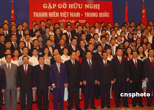 “越南中国山连山,江连江,共临东海,我们的友谊像朝阳。朝相见,晚相望,清早共听雄鸡唱。共理想,心相连,胜利路上红旗扬。两国人民呼万岁,胡志明,毛泽东!”当中越两国青年分别用自己的语言,共同唱响这首老歌,全场气氛达到高潮。胡锦涛和农德孟一边鼓掌一边挥手致意,随后与大家合影留念。
