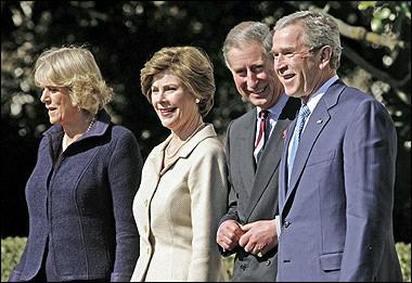 中新网11月3日电 据法新社报道,英国王储查尔斯今天偕同夫人卡米拉,从纽约搭乘专机抵达白宫,受到美国总统布什与第一夫人劳拉热情欢迎。身穿全套西服的查尔斯与着深色套装的卡米拉下飞机后,乘豪华礼车前往白宫,布什伉俪已在门口相迎。