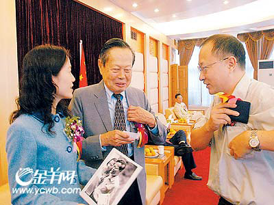 今天上午,杨振宁夫妇乘一辆小车进入广东外语外贸大学。两人走入行政楼贵宾室后,羊城晚报总编辑张宇航微笑着迎了上去,将杨振宁和翁帆女士十年前在汕头大学的黑白纪念照送上。杨振宁惊喜地接过照片:“谢谢!那时我和翁帆是初次见面。”翁帆在一旁专注地看着、并轻轻抚摸了照片,轻声说道:“很美,拍得很美。” (康建、冯明媚、孔晓明)