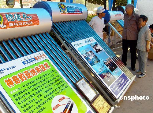 11月7日,据2005北京国际可再生能源大会消息,到2020年太阳能热水器总集热面积将达3亿平方米,年替代化石能源约4000万吨标准煤,这将给中国太阳能热水器市场带来巨大商机。统计显示,目前中国可再生能源利用正以年均超过25%的速度发展,其中太阳能热水器集热面积已达6500万平方米。图为湖北宜昌街头商家展销太阳能热水器。作者:刘君凤