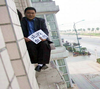 昨日上午,一名男子爬上该公司三楼的空调窗外沿,手持一张写有“还我血汗钱”的字幅。尽管整个身体在30公分的窗台上摇摇晃晃,但该男子仍然口中不停地念叨着“还钱、还钱”。几位热心市民上前劝说:“先下来,什么事情不能好好说呢?”可该男子根本不听,他们只好无奈地走开了。