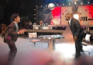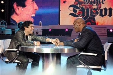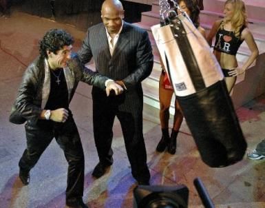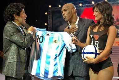 中新网11月9日电 11月7日,在阿根廷首都布宜诺斯艾利斯,前重量级世界拳击冠军泰森和足坛传奇人物马拉多纳亲密接触,相会在马拉多纳主持的周播节目“十日之夜”的制作现场。