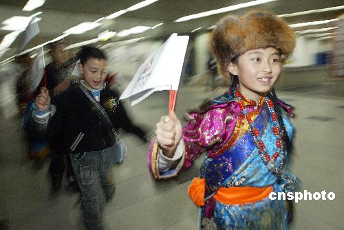 十一月八日,六十六名来自甘肃的北京二○○八奥运会吉祥物西部小使者乘坐火车抵达北京,这些小使者有汉、回、满、白、蒙古、藏、哈萨克、东乡等多个民族,他们将在七位老师的带领下,在北京度过一周的奥运之旅。图为作为小使者的藏族小姑娘扎西卓玛跟随队伍抵达北京。作者:盛佳鹏