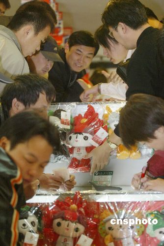 中新网11月11日电 据《北京晨报》报道,今天是北京2008年奥运会吉祥物与世界人民见面的日子。从12日开始,吉祥物系列商品将开始在北京奥组委授权的特许商品零售店(点)销售。