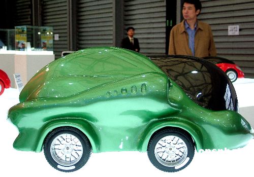 11月11日,正在上海新国际博览中心举办的2005上海国际工业博览会,上海工业协会自主设计的绿色外壳汽车模型在展会中展出,造型新颖,外形可爱,引起参观者的注意。作者:井韦