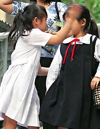 喜儿8日下午4时放学时,由菲佣接回家,同行女同学想逗她玩,不时拍她肩膀叫‘喂’,不料她冷不防回头掴了对方一巴掌,大叫“不要整我”,还双手握拳,一副“别惹我”的姿态。