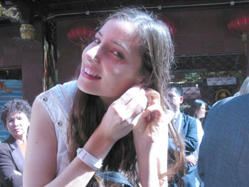 早上十点左右,模特儿们一到城隍庙,就立刻被琳琅满目的各种饰品所吸引,三五成群地拥在卖珍珠饰品的摊位前面,再也不肯离开。两位意大利美女,看着各种颜色的珍珠耳环,左挑右捡,不知道选哪个颜色好最好。颇具南方美女风情的Caterina,因为肤色较深,挑选了一副紫色的耳环,而面孔白皙秀丽的Giusy则购买了一副白色的小耳环。她说在意大利,女孩子是非常喜欢用耳环来修饰自己的。有趣的是,买好之后,两位美女迫不及待地就戴上了,还在镜头前神气地炫耀一番。