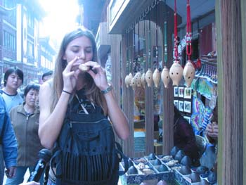 有些模特儿不但买东西,还兴致勃勃地浏览各种有趣的事情。来自希腊的Sophia看见一个摊位上摆放着中国的古代乐器陶郧,就随手拿起一个把玩起来。因为不知道如何演奏,她怎么弄也弄不出声音,让这个15岁的小姑娘颇为失望。好在卖陶郧的小贩很热情,耐心地再一次告诉她演奏的诀窍,她这才能够有模有样地吹奏起来。当悠扬的调子从乐器中缓缓传出来的时候,周围的人都为这个聪明的女孩儿鼓起掌来!