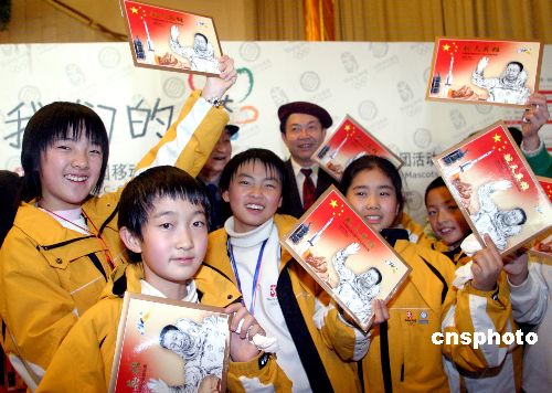 十一月十四日,来自甘肃、青海、四川等十二个西部省市自冶区的一百名“北京奥运西部小使者观摩团”成员来到北京华北大酒店,把自己的手印按在了著名艺术家袁熙坤创作的“100+1的梦想”主题雕塑上,并获得由袁熙坤设计的中国首位航天员杨利伟个性化纪念邮票。作者:张勤