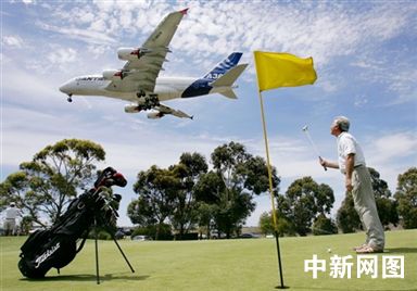 11月14日, 高尔夫球手迪姆·摩尔站在墨尔本机场高尔夫俱乐部球场上,一架崭新的“空中客车”A380从他头上经过,降落在墨尔本Tullamarine机场。这是A380诞生以来首次离开欧洲。A380有七层楼高,可乘纳800名旅客。