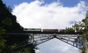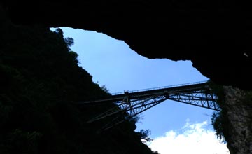 人字桥:在屏边县北湾圹乡度箐与倮姑站之间,是滇越铁路上(昆明至越南河内)全用钢板、槽、角钢、铆钉联接而成的巨型钢架桥。人字桥在两山峭壁之间的跨度为67米,距谷底100米。此桥是由法国女工程师鲍尔.波丁设计,于1907年3月10日动工,1908年12月6日竣工。1998年公布为云南省文物保护单位。中法滇越铁路行今天至此。