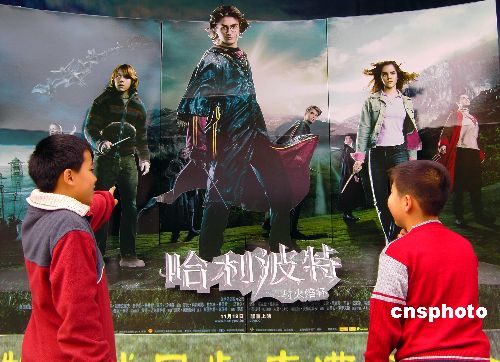 11月17日,在湖北宜昌市解放电影院前,两个中学生在欣赏《哈利·波特与火焰杯》电影海报。根据J.K.罗琳系列畅销小说改编的2005年度大片《哈利·波特与火焰杯》将于11月18日在全球同步上映。作者:刘君凤