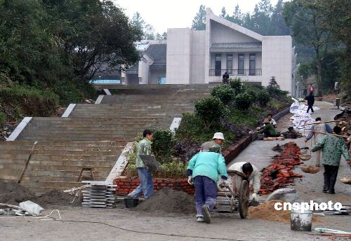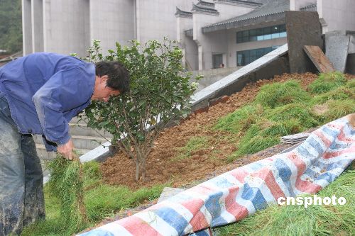 11月18日,为纪念已故中共前总书记胡耀邦诞辰90周年,工人们在位于湖南省浏阳市中和乡苍坊村的胡耀邦纪念馆门前植草皮。作者:白祖偕