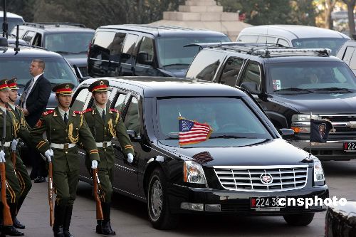 十一月二十日,一队解放军礼兵经过美国总统布什的座驾。当日上午,中国国家主席胡锦涛在北京人民大会堂举行仪式,欢迎来访的美国总统布什。作者:毛建军