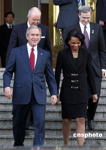 十一月二十日,美国总统布什在北京人民大会堂与中国国家主席胡锦涛共同会见记者后,与国务卿赖斯等一起兴高采烈地走出人民大会堂。作者:毛建军
