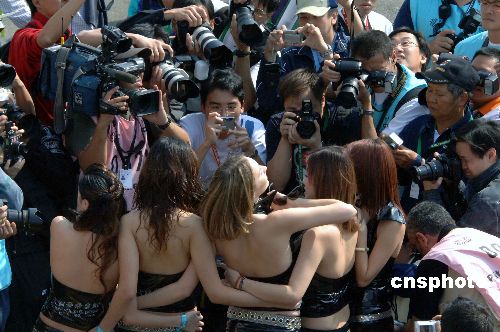 一批“性感女郎”与参赛车手合影为他们助阵。