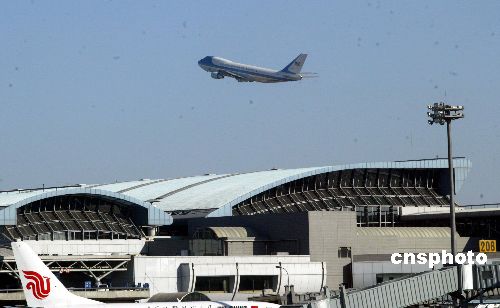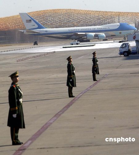 十一月二十一日,美国总统布什结束对中国的访问,乘坐“空军一号”专机飞离北京机场。作者:史利