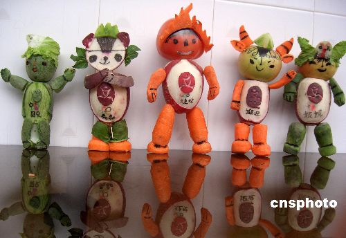 图:山东母子用蔬菜制作"福娃"