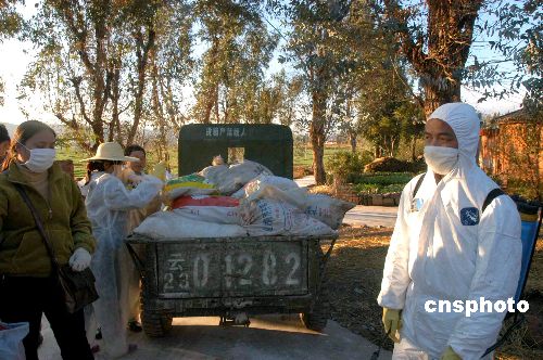 今天下午,记者在荷花村看到七名村民正在忙于扑杀村里所剩不多的家禽,他们均戴着消毒手套。六十岁的董学文称,他并不紧张。“估计不会感染到人”。据村民反映,政府决定给饲养家禽者给予补贴,标准是成鸡每只十元人民币,幼鸡每只五元。