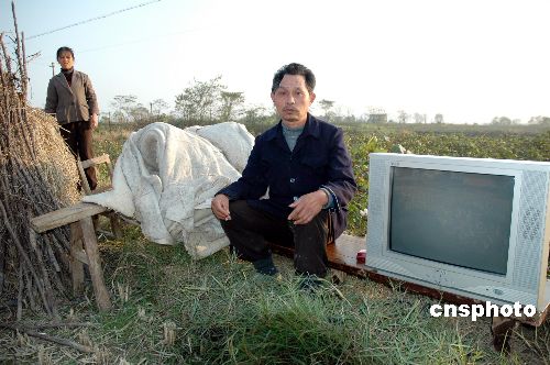 图为江西九江县港口街镇洗心桥村一八岁小女孩在此次地震中因房屋倒塌被砸身亡,其母在郊外摆床搭铺以避余震。作者:段长征