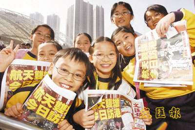 中新网11月28日电 神六双雄费俊龙、聂海胜为国家航天史创下新的里程碑,香港以至珠三角顿掀起一股强烈的“太空热”,更有远至广州的“追太空双星族”,一早已部署计划,并专程抵港一睹“双雄”风采。部分人还表示,会一直追随“双雄”至澳门,期望能跟偶像握手和索签名。