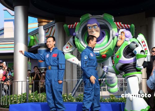 28日下午,“神舟六号”两名航天员费俊龙和聂海胜,探访香港迪斯尼乐园,并与“巴斯光年”合影。作者:洪少葵