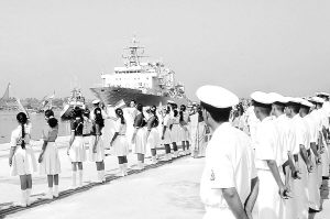 中国海军舰艇编队在印度海军“沙尔答”号海上巡逻舰的引导下,缓缓驶进科钦港。随后,两国海军互鸣21响礼炮致礼,印度南部海军军区司令部参谋长拉金德·辛格少将、海军礼宾官、训练中队军官,以及中国驻印使领馆人员、旅印华侨和留学生代表到码头迎接。中国驻印度大使孙玉玺夫妇专程赶到科钦港看望了中国海军出访编队官兵。