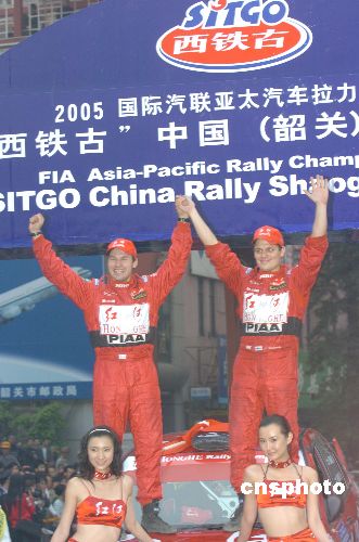 2005“西铁古”亚太地区汽车拉力赛28日在中国广东韶关落下帷幕﹐经过三天的激烈争夺﹐中国云南红河车队芬兰籍车手朱瑟和领航员米可夺得冠军。作者:赵振清