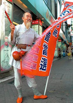 谁会当选?经常在西门町街头出现的“净仙”举着谁会当选的旗帜,预测下届“总统”、台北县长、台中市长的当选人,在人来人往的西门闹区显得相当突兀。(台湾联合报图)