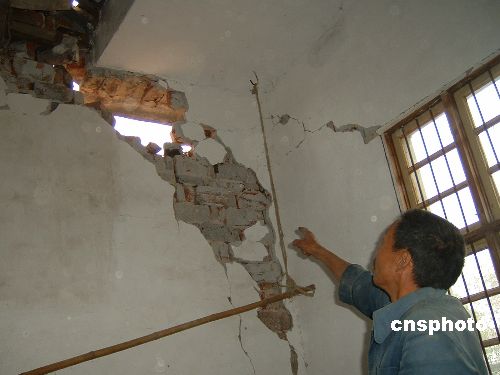 十一月二十九日,九江市港口镇震中附近的富塘村一村民介绍自家房屋受损状况。二十六日发生在江西九江县与瑞昌市之间的五点七级地震波及湖北、安徽等周边省份,造成江西、湖北两省十三人死亡,共计八千多人不同程度受伤,六十余万人需转移安置,一万八千多间房屋倒塌或成危房,损坏十五万多间。作者:徐金波