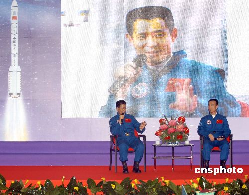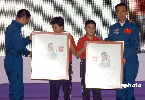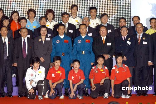 “神舟六号”载人航天飞行访港代表团11月29日下午在香港将军澳体育馆出席《与运动健儿交流》活动,宇航员费俊龙及聂海胜与民政事务局局长何志平、康文署署长王倩仪、及出席嘉宾、香港运动员代表上台合照。 作者:邓庆乐