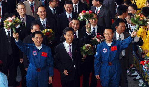 代表团团长、载人航天工程副总指挥胡世祥;航天员费俊龙、聂海胜;副团长──国务院港澳办副主任周波、载人航天工程办公室副主任宿双宁、航天科技集团公司副总经理许达哲;秘书长、载人航天工程国际合作部副部长任正祥一行中午抵达外港码头,澳门特别行政区政府代表、运输工务司司长欧文龙;中央驻澳门特别行政区联络办公室副主任王今翔;以及科技委员会两个工作小组的召集人—— 廖泽云和杨俊文到场迎接。团长、副团长及两名航天员接受小童献花,并受到在场五百多名群众热烈欢迎;一行随即前往下榻的新竹苑。
