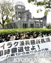 中新网12月8日电 据日本共同社报道,日本广岛县禁止核武器协会(代表委员:片山春子)约90名会员今天在广岛市中区的原子弹爆炸纪念馆前静坐示威,抗议政府延长自卫队驻伊期限。