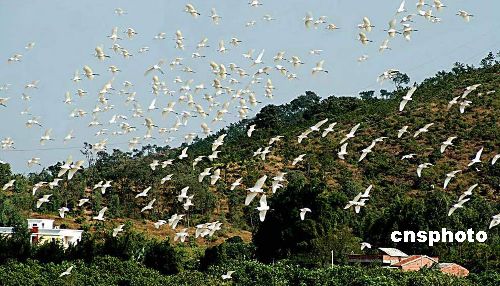 近年来,因重视生态环境保护,广东惠州市惠城区水口镇的鹭鸟逐渐增多。图为该村里时时可见到数千只鹭鸟在天空飞翔。 作者:宋秀杰