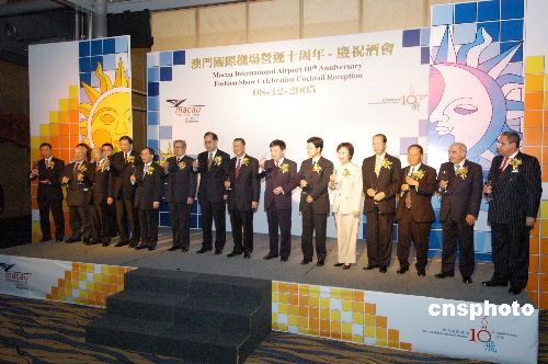 八日,澳门国际机场专营股份有限公司在旅游塔会展娱乐中心为“澳门国际机场营运十周年”举行庆祝酒会,澳门特首何厚铧、澳门中联办副主任何晓卫、中国民航总局副局长高宏峰等出席酒会并向在场嘉宾祝酒。 作者:梁永强
