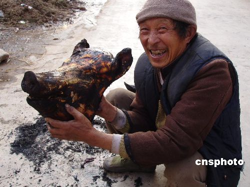 十二月七日,一位老人在烧洗狗年春节上将享用的猪头。进入农历冬月,三峡奉节地区农村便弥漫着浓浓的过年味,大人和孩子喜气洋洋地开始宰杀肥猪、做香肠、熏腊肉,筹办除夕年夜饭。 作者:周会