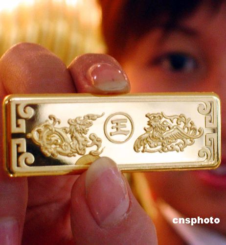 12月9日,济南市齐鲁金店,工作人员在展示一款“姓氏金条”。“姓氏金条”是该金店自主设计并生产的,以龙凤呈祥为图案,中间为一镌有姓氏的金珠,边衬如意图案,寓意吉祥如意。这款金条统一重量为56克,采用9999千足金制作而成,每款售价9968元。作者:龚辉