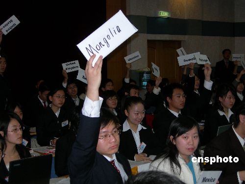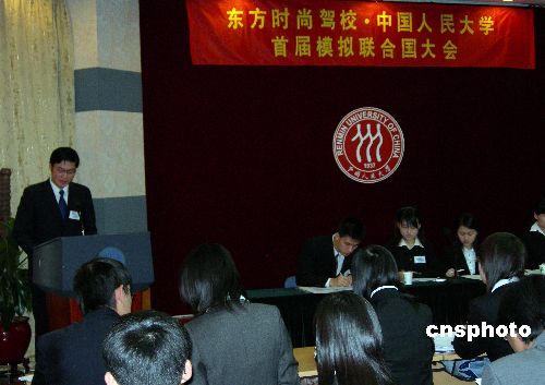 12月11日,人大学子在模拟联合国大会。当日,中国人民大学首届模拟联合国大会在该校逸夫会议中心举行。大会的议题是核弹头与核材料控制,会议采用全英文进行。来自中国人民大学的82名优秀学生代表41个主权国家和1个非政府组织在大会上阐述了各自的“立场”。据组织者介绍,这次大会将为2006年哈佛大学世界模拟联合国大会选拔与会代表。 作者:王振001