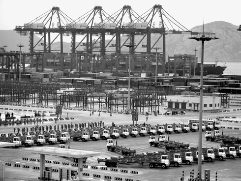 沿着码头树立的10多座高50米以上的红色集装箱桥吊在细雨中吊起集装箱,装到3艘超大型集装箱船上。这些船计划前往欧洲。1.5平方公里大小的集装箱堆场上,数百个集装箱正等待装船。还有一些写着韩进海运、现代商船等韩国海运公司英文名字的集装箱。