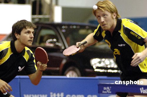 2005年国际乒联巡回赛总决赛十一号在中国福州继续进行,德国组合波尔/苏斯以四比一击败韩国选手李廷佑/吴尚垠夺得男双冠军. 作者:王东明