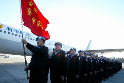 中新网12月12日电 公安部网站 消息,12月12日,中国第三支维和警察防暴队95名队员搭乘由联合国包租的海南航空公司专机从北京首都国际机场启程,赴联合国海地任务区执行轮换任务。公安部党委委员、部长助理孙永波和公安部维和事务领导小组成员单位及山东省公安厅领导到机场送行。