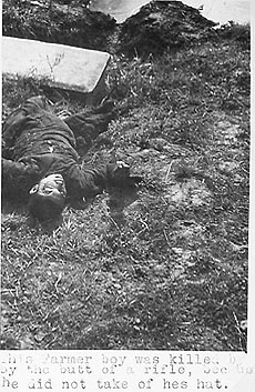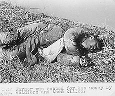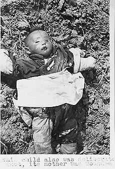 似乎知道会有人抵赖,玛丽安提供的光盘中还有一张为人们从未见过的小孩被日军打死的照片:“这个农民的男孩被(日军)枪托打死,因为他没有脱帽”。