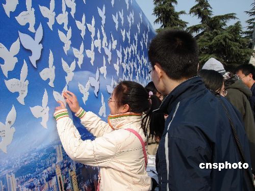 13日上午,“悼念侵华日军南京大屠杀30万同胞遇难68周年仪式暨南京国际和平日集会”在侵华日军南京大屠杀遇难同胞纪念馆隆重举行。社会各界约3000多人参加了和平集会。一位同学将雪白的和平鸽剪纸贴在墙上,象征着对和平的向往。作者:丁梅